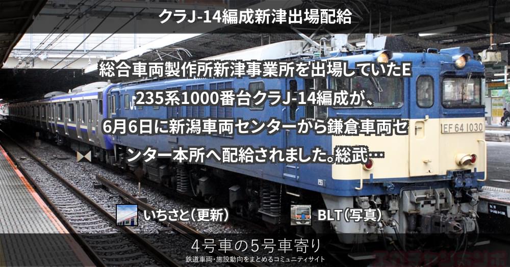 総合車両製作所新津事業所を出場していたE235系1000番台クラJ-14編成が、6月6日に新潟車両センターから鎌倉車両センター本所へ配給されました。