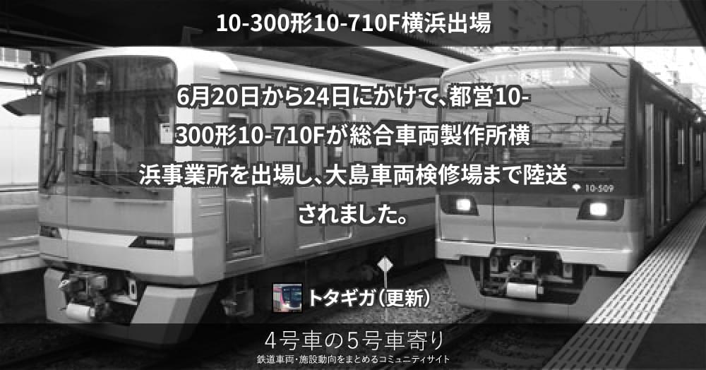 6月20日から24日にかけて、都営10-300形10-710Fが総合車両製作所横浜事業所を出場し、大島車両検修場まで陸送されました。
