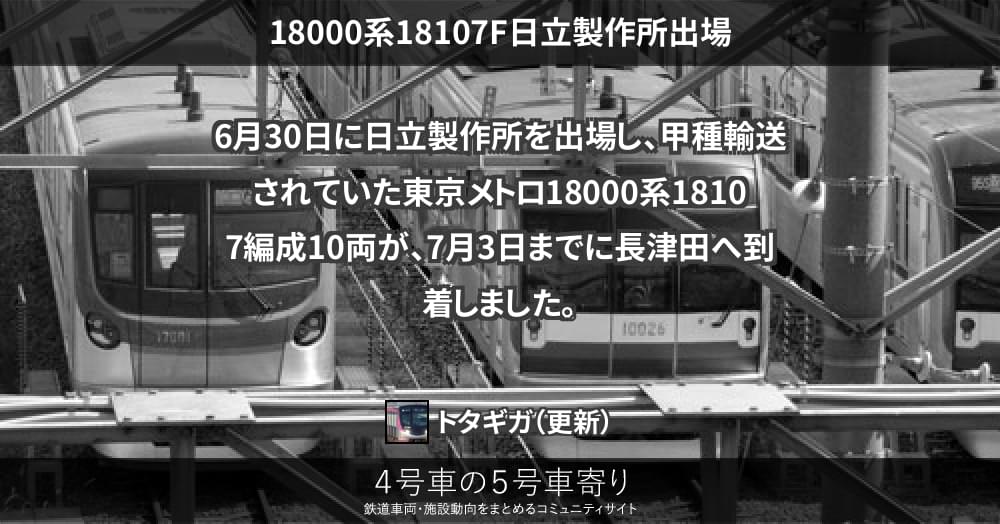 6月30日に日立製作所を出場し、甲種輸送されていた東京メトロ18000系18107編成10両が、7月3日までに長津田へ到着しました。
