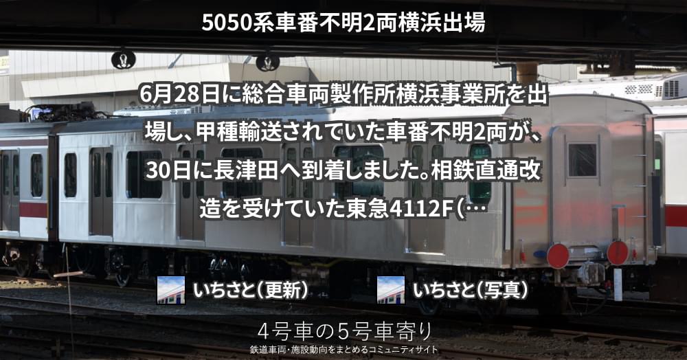 本日未明、していた東急5050系5166Fと、車番不明の中間車2両が出場しました。出場に際して、旧5166Fは同系4000番台の新4112Fに改造されており、クハ4010(推測)には10号車を示すステッカーが貼られていることから、10両化が...