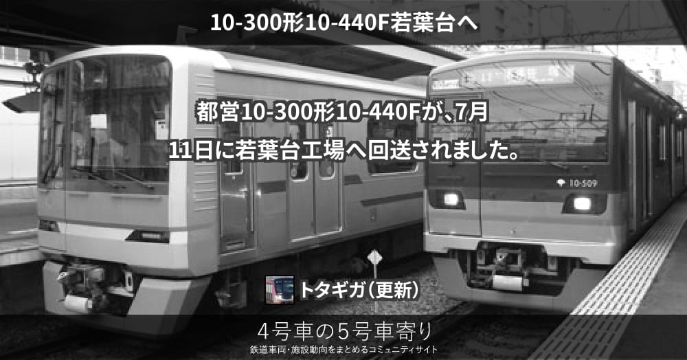 本日、都営新宿線10-300形8両編成の10-440Fが大島車両検修場から若葉台車両基地へ不定期回送されました。同編成の最終運用は、7月8日の平日11T運用でした。東京都交通局では、が京王重機により落札され、10-370F、10-390F、...