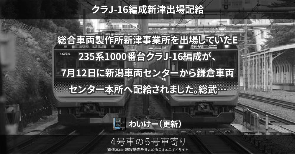 総合車両製作所新津事業所を出場していたE235系1000番台クラJ-16編成が、7月12日に新潟車両センターから鎌倉車両センター本所へ配給されました。