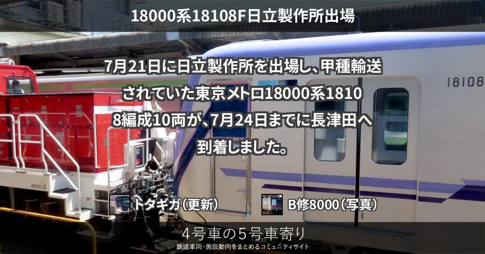 7月21日に日立製作所を出場し、甲種輸送されていた東京メトロ18000系18108編成10両が、7月24日までに長津田へ到着しました。