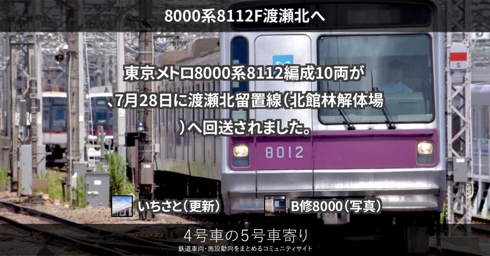 本日、東京メトロ8000系の8112Fが鷺沼検車区から回送されています。運番から廃車回送と推測され、旧北館林荷扱所へ入場するものと思われます。推定される検査期限が最も近い編成だったため、動向が注目されていました。同編成は8000系の中で10...