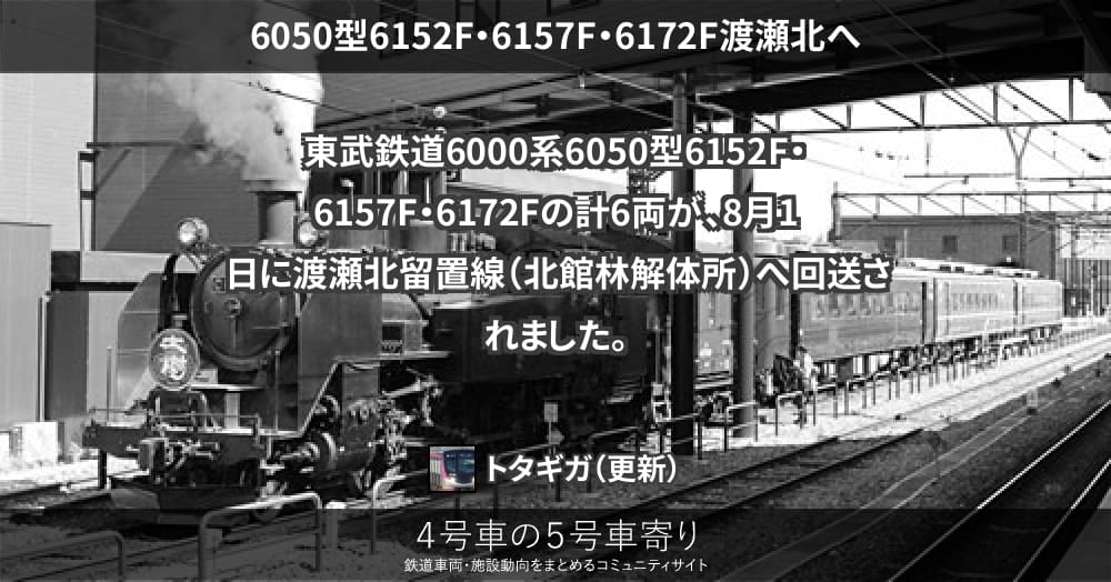 本日、東武6050型6172F、6152F、6157Fの3編成6両が、南栗橋車両管区新栃木出張所から出庫し、旧北館林荷扱所方面へ回送されています。前例から廃車されるものと見られ、車体更新車は6162Fの残り1編成となる見込みです。