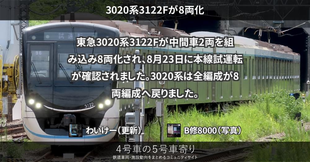 東急3020系3122Fが中間車2両を組み込み8両化され、8月23日に本線試運転が確認されました。