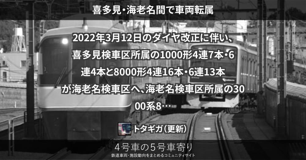 2022年3月12日のダイヤ改正に伴い、喜多見検車区所属の1000形4連7本・6連4本と8000形4連16本・6連13本が海老名検車区へ、海老名検車区所属の3000系8連8本・10連12本が喜多見検車区へ、それぞれ転属しました。