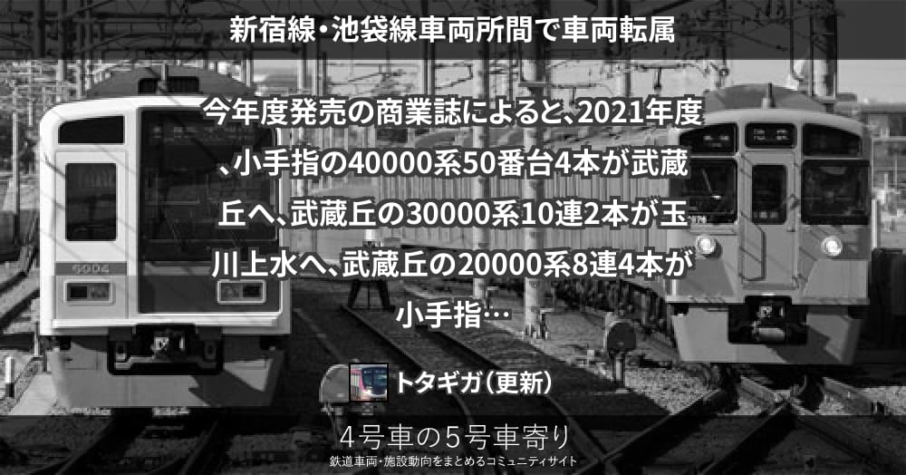 今年度発売の商業誌によると、2021年度、小手指の40000系50番台4本が武蔵丘へ、武蔵丘の30000系10連2本が玉川上水へ、武蔵丘の20000系8連4本が小手指へ、武蔵丘の20000系10連1本が玉川上水へ、玉川上水の2000系4連2本が南入曽へ、南入曽の2000系8連1本が武蔵丘へ、それぞれ転属しました。また多摩川線・狭山線の車両交換として、小手指から玉川上水へ4本、玉川上水から小手指へ5本が転属しました。