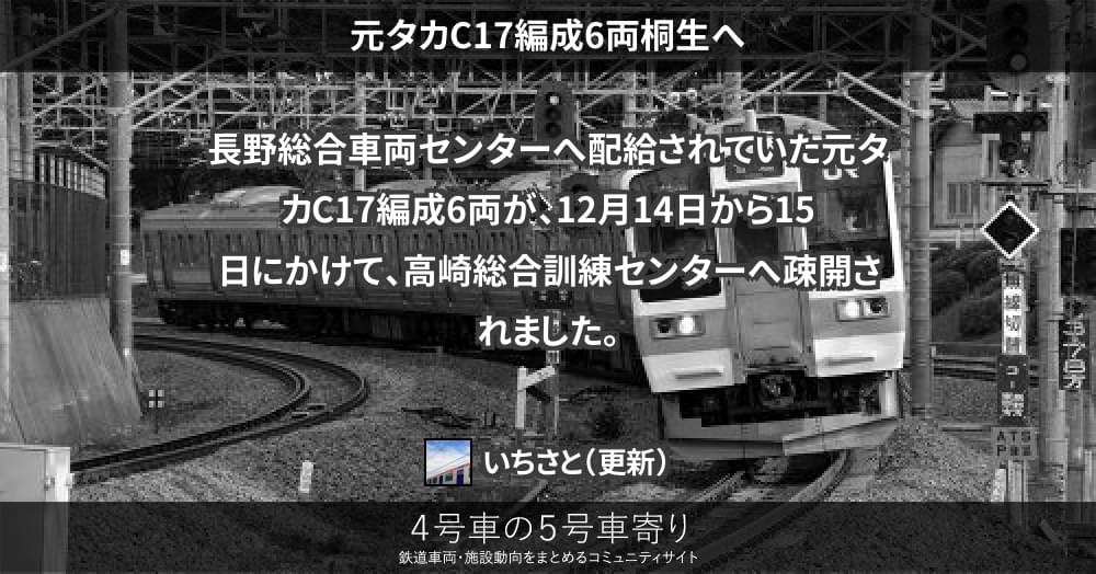 長野総合車両センターへ配給されていた元タカC17編成6両が、12月14日から15日にかけて、高崎総合訓練センターへ疎開されました。