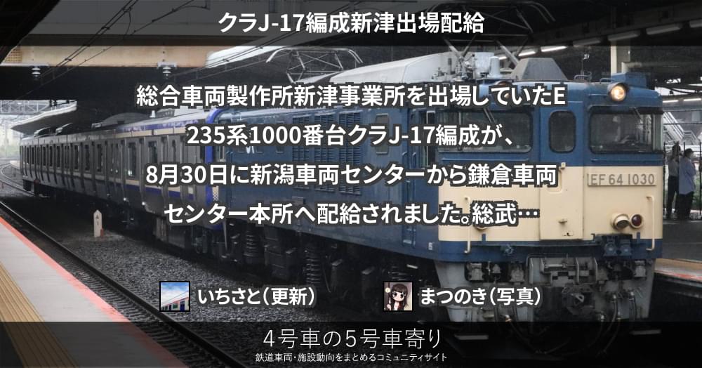 総合車両製作所新津事業所を出場していたE235系1000番台クラJ-17編成が、8月30日に新潟車両センターから鎌倉車両センター本所へ配給されました。