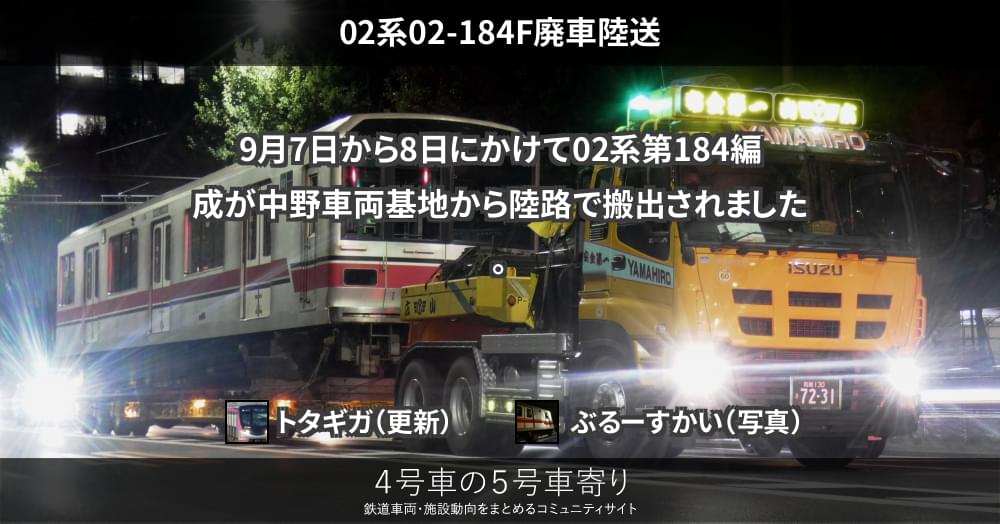 9月7日から8日にかけて02系第184編成が中野車両基地から陸路で搬出されました。