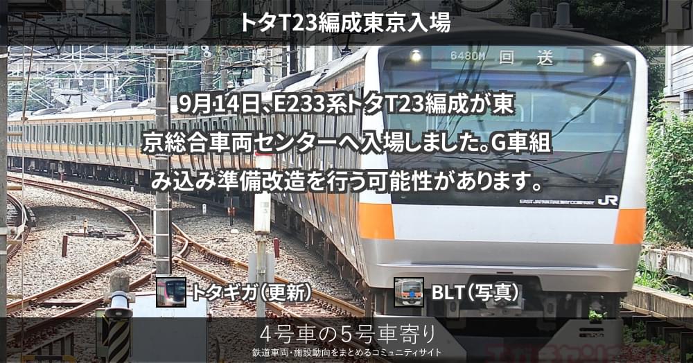 9月14日、E233系トタT23編成が東京総合車両センターへ入場しました。