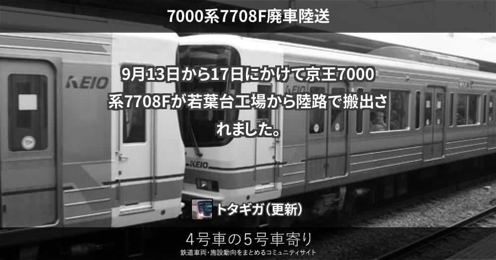 9月3日に若葉台車両基地へ、その後、されていた京王7000系7708Fですが、9月13日、15日、17日にそれぞれ搬出が確認されています。京王の搬出は通例2両ずつで、13日は5・6号車、15日は1号車、17日は3・4号車が確認できるため、6...