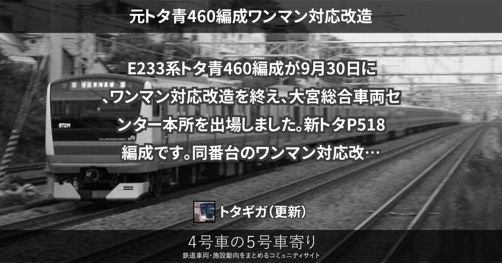 9/30、E233系0番台元トタ青460編成が大宮総合車両センター工場(OM)を出場し、豊田車両センターへ自走で回送されています。安全確認カメラの追設など、中編成ワンマン運転対応改造が行われ、編成番号もグループの通り「P518」に改められて...