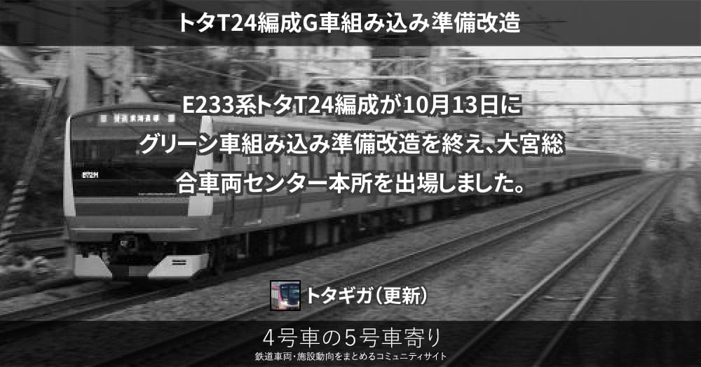 E233系トタT24編成が10月13日にグリーン車組み込み準備改造を終え、大宮総合車両センター本所を出場しました。