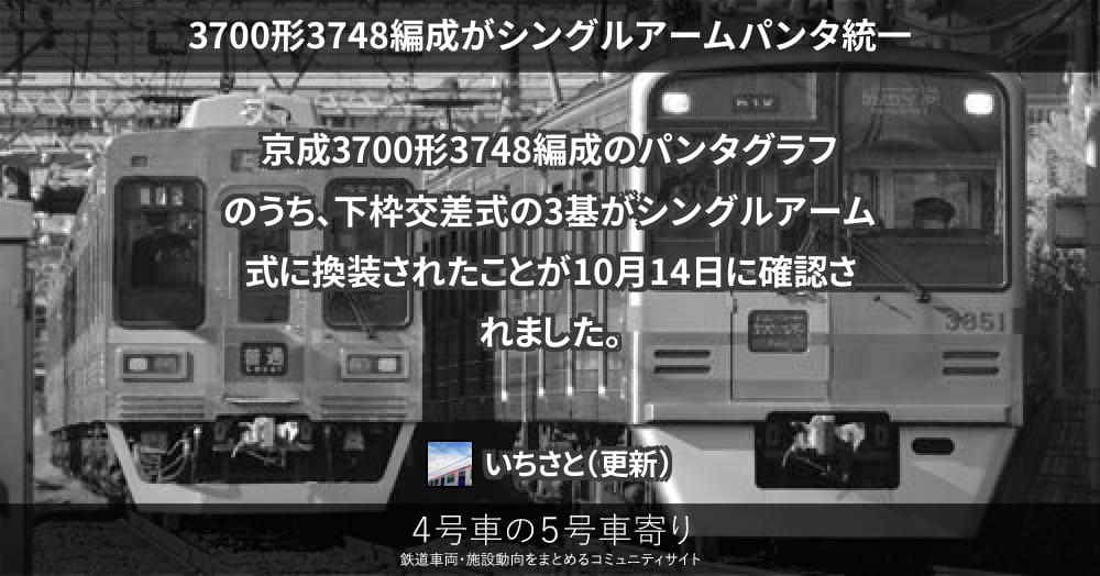 本日時点で、同形式の3748編成(3748F)のパンタが全車両シングルアーム型に統一されたのが確認されています。同編成の内3742号車は、パンタが下枠交差型と混在している事が特徴でした。また、同編成の交換を以って、京成3700形から下枠交差...
