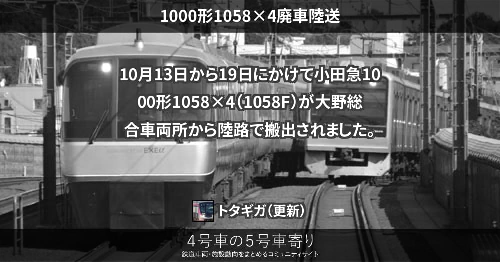 10月13日から19日にかけて小田急1000形1058×4(1058F)が大野総合車両所から陸路で搬出されました。
