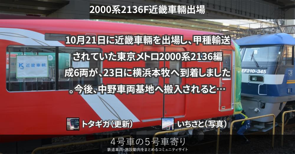 10月21日に近畿車輛を出場し、甲種輸送されていた東京メトロ2000系2136編成6両が、23日に横浜本牧へ到着しました。