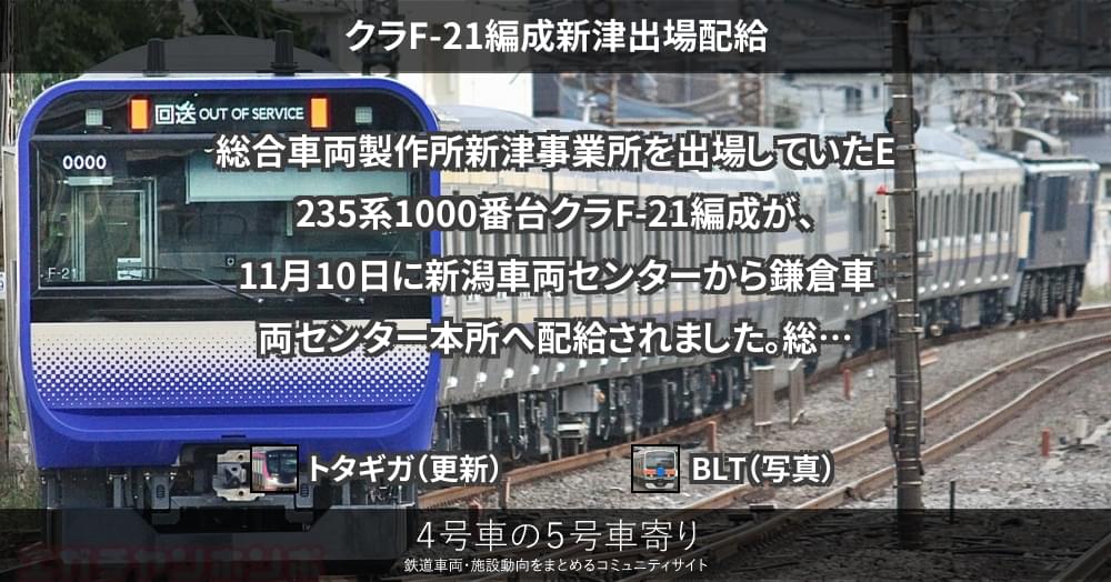 総合車両製作所新津事業所を出場していたE235系1000番台クラF-21編成が、11月10日に新潟車両センターから鎌倉車両センター本所へ配給されました。