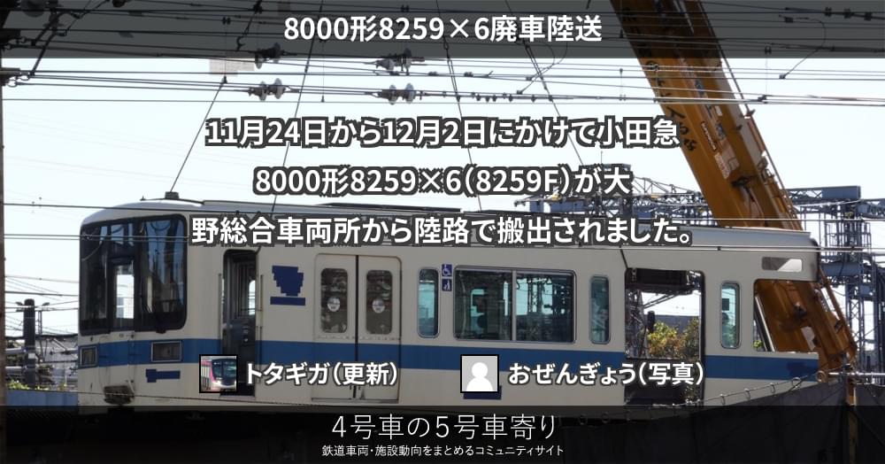 11月24日から12月2日にかけて小田急8000形8259×6(8259F)が大野総合車両所から陸路で搬出されました。