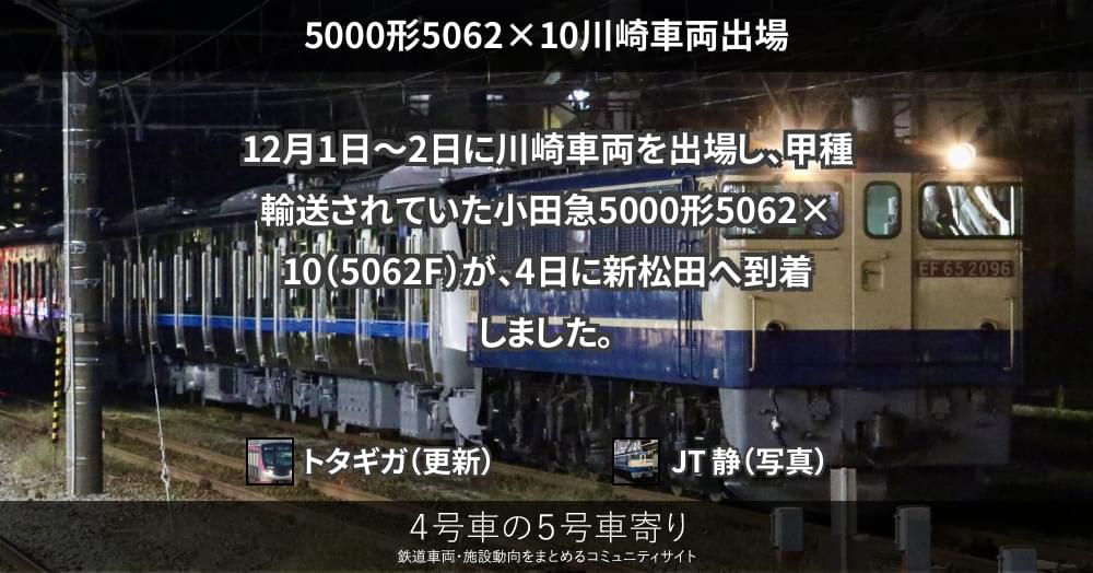 本日、小田急5000形5062x10(5062F)のうち6両が川崎車両を出場し、甲種輸送されています。通例通りなら後日残りの4両も出場し、10両で首都圏へ輸送されるものとみられます。同形式は今年度3編成の導入が予定されており、同編成はそのう...