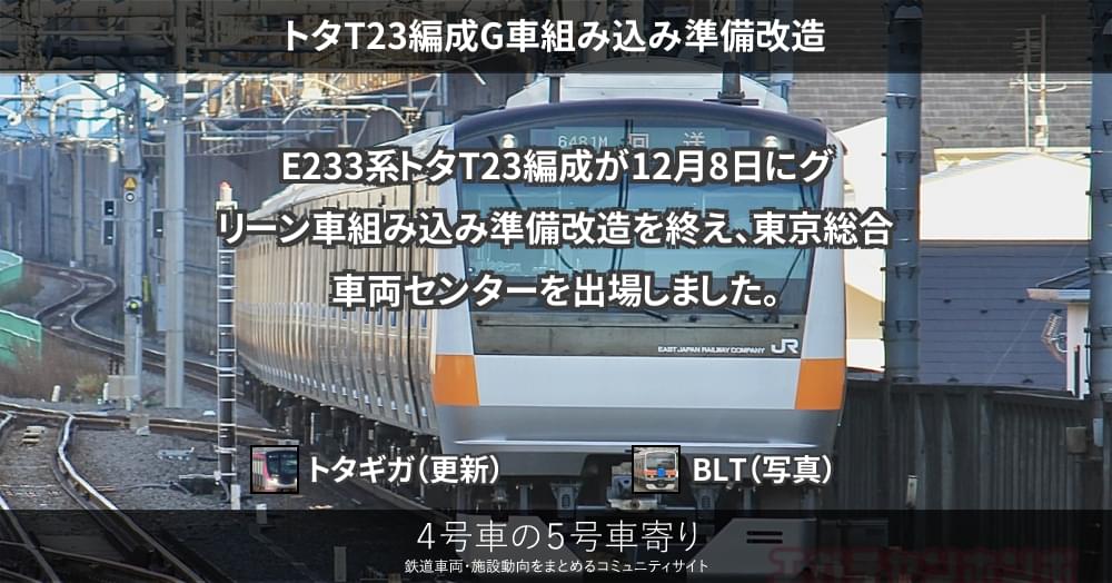 E233系トタT23編成が12月8日にグリーン車組み込み準備改造を終え、東京総合車両センターを出場しました。