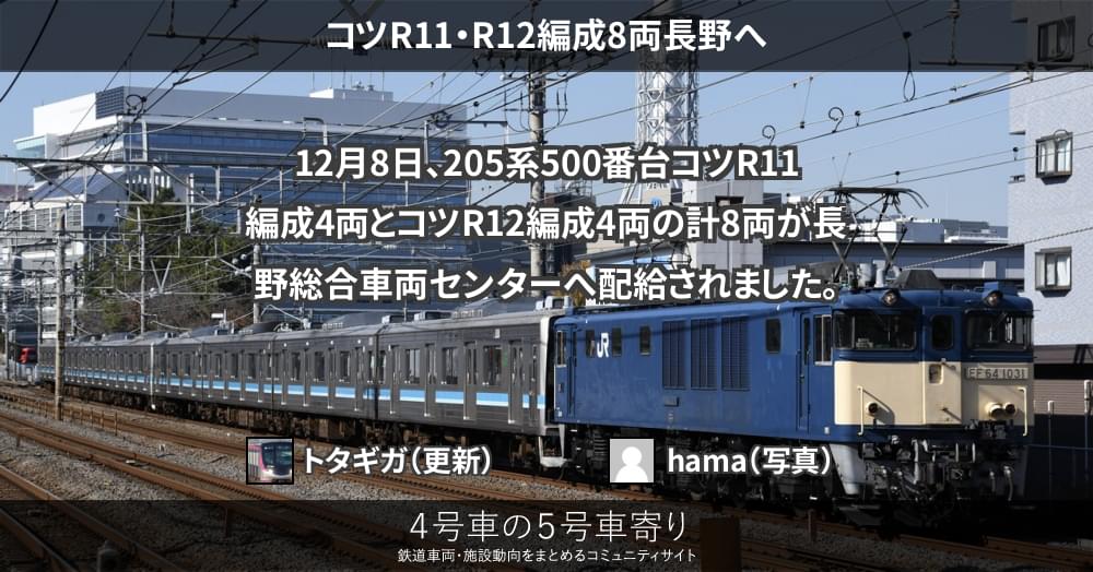 12月8日、205系500番台コツR11編成4両とコツR12編成4両の計8両が長野総合車両センターへ配給されました。