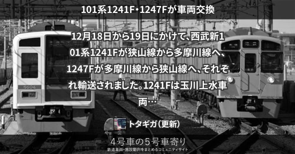 12月18日から19日にかけて、西武新101系1241Fが狭山線から多摩川線へ、1247Fが多摩川線から狭山線へ、それぞれ輸送されました。