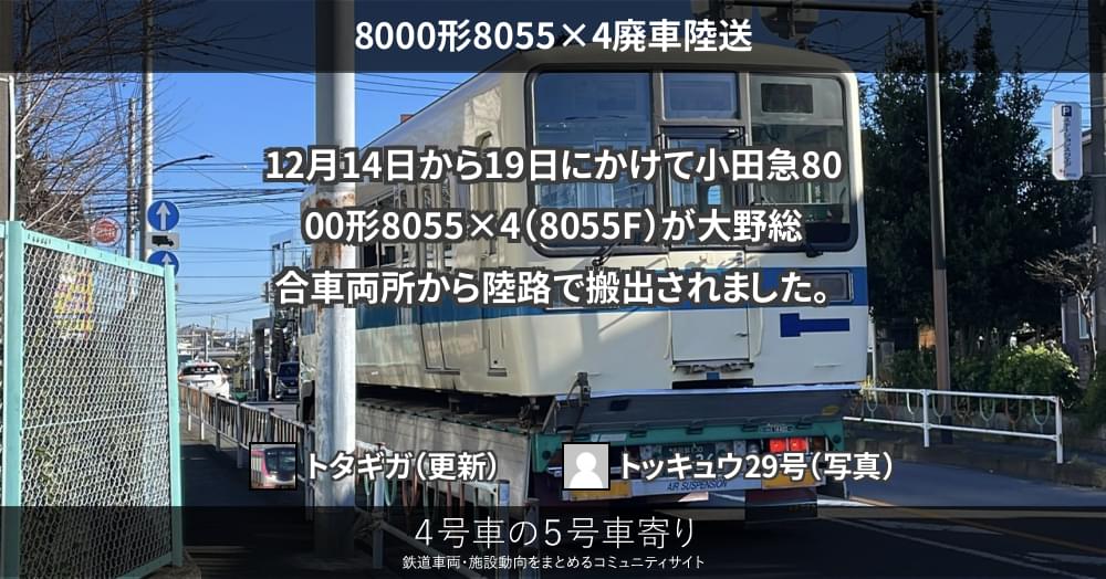 12月14日から19日にかけて小田急8000形8055×4(8055F)が大野総合車両所から陸路で搬出されました。