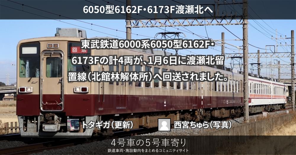 東武鉄道6000系6050型6162F・6173Fの計4両が、1月6日に渡瀬北留置線(北館林解体所)へ回送されました。
