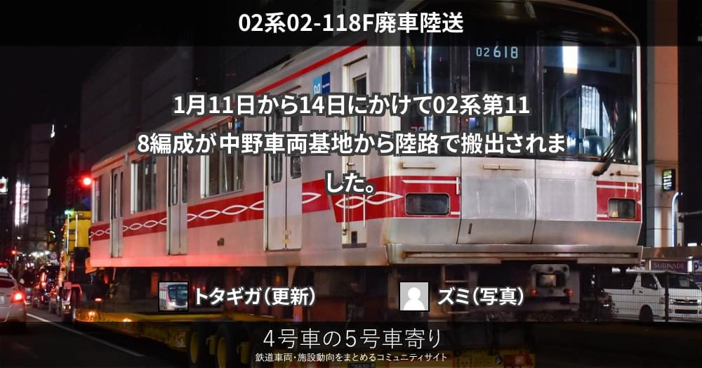 1月11日から本日未明までに、東京メトロ丸ノ内線02系02-118Fが中野車両基地から搬出されました。同形式6両編成では37本目、更新車に限れば3本目の廃車となる見込みです。同編成は2013年度のB修繕工事施工車です。