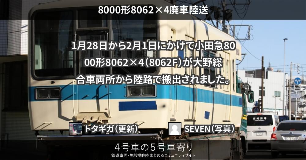 1月28日から2月1日にかけて小田急8000形8062×4(8062F)が大野総合車両所から陸路で搬出されました。