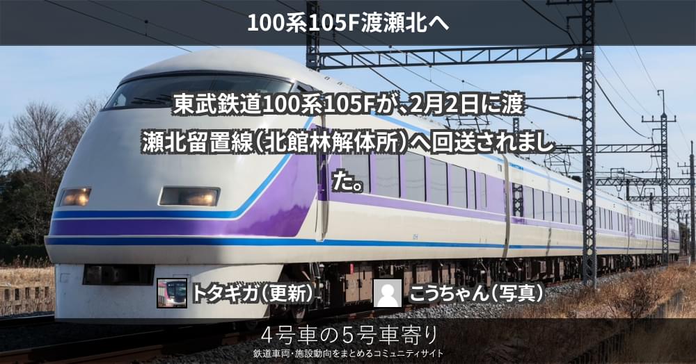 東武鉄道100系105Fが、2月2日に渡瀬北留置線(北館林解体所)へ回送されました。
