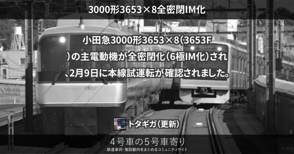 小田急3000形3653×8(3653F)の主電動機が全密閉化(6極IM化)され、2月9日に本線試運転が確認されました。