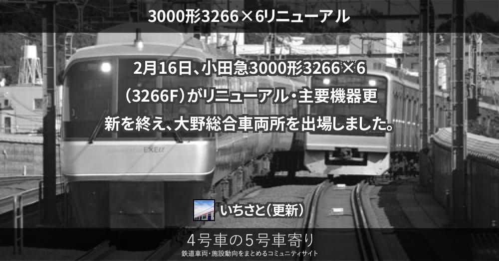 2月16日、小田急3000形3266×6(3266F)がリニューアル・主要機器更新を終え、大野総合車両所を出場しました。