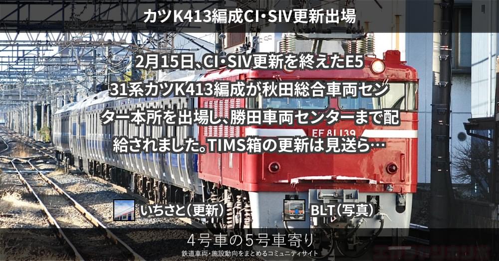 2月15日、CI・SIV更新を終えたE531系カツK413編成が秋田総合車両センター本所を出場し、勝田車両センターまで配給されました。
