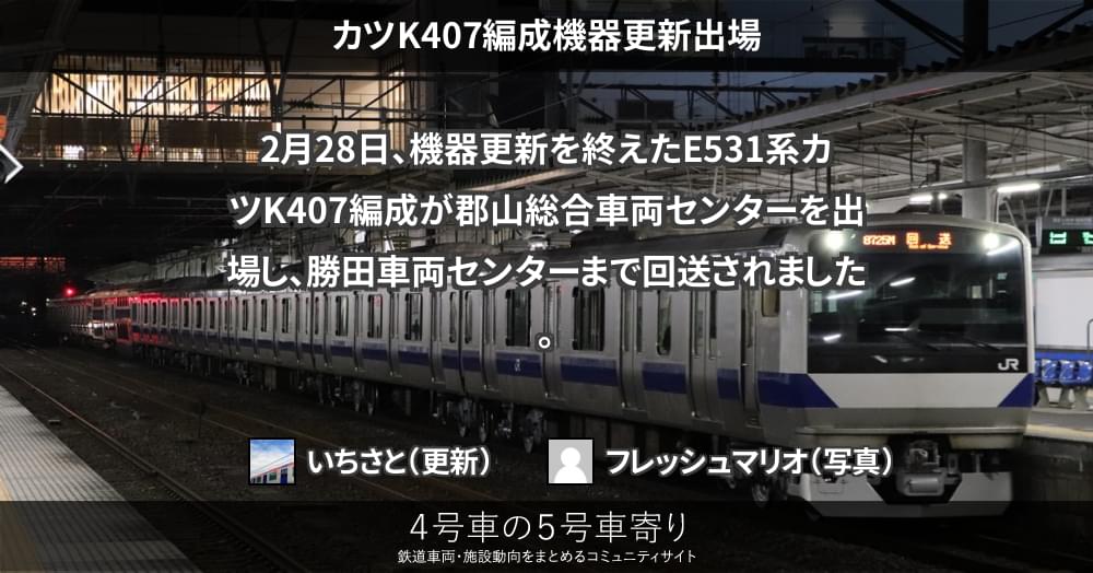 2月28日、機器更新を終えたE531系カツK407編成が郡山総合車両センターを出場し、勝田車両センターまで回送されました。
