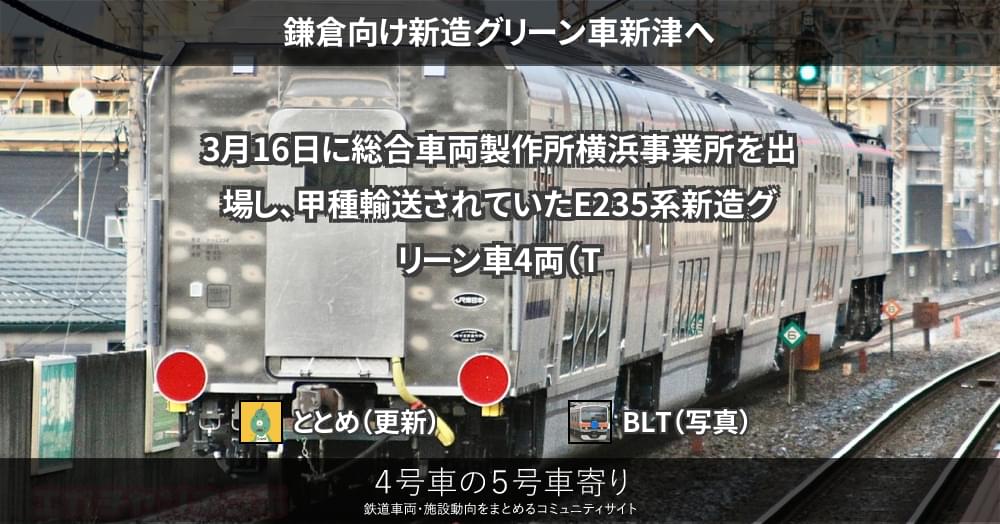 3月16日に総合車両製作所横浜事業所を出場し、甲種輸送されていたE235系新造グリーン車4両(TsdTsd’1025~1026)が、17日に新津へ到着しました。