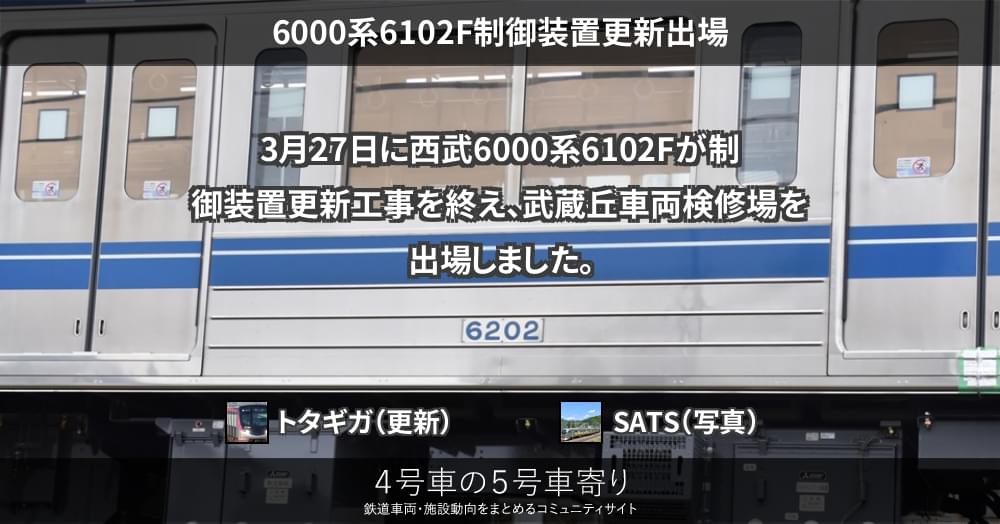3月27日に西武6000系6102Fが制御装置更新工事を終え、武蔵丘車両検修場を出場しました。