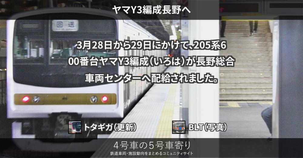 3月28日から29日にかけて、205系600番台ヤマY3編成(いろは)が長野総合車両センターへ配給されました。