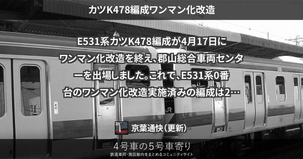 E531系カツK478編成が4月17日にワンマン化改造を終え、郡山総合車両センターを出場しました。