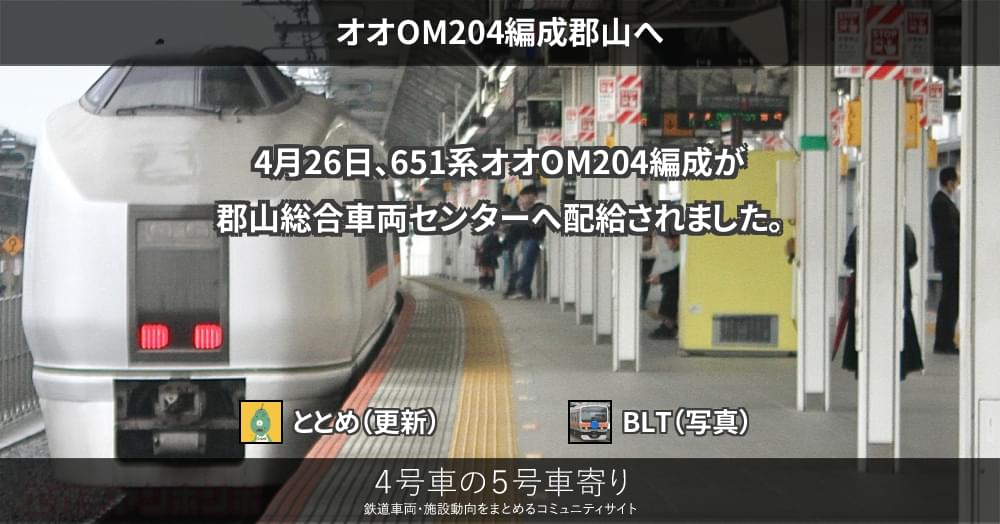 4月26日、651系オオOM204編成が郡山総合車両センターへ配給されました。