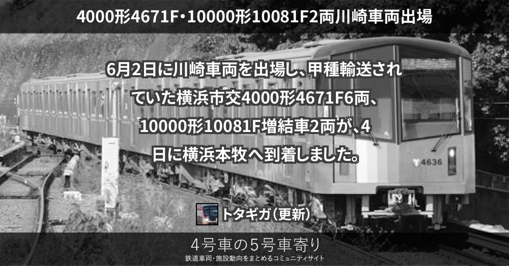 6月2日に川崎車両を出場し、甲種輸送されていた横浜市交4000形4671F6両、10000形10081F増結車2両が、4日に横浜本牧へ到着しました。