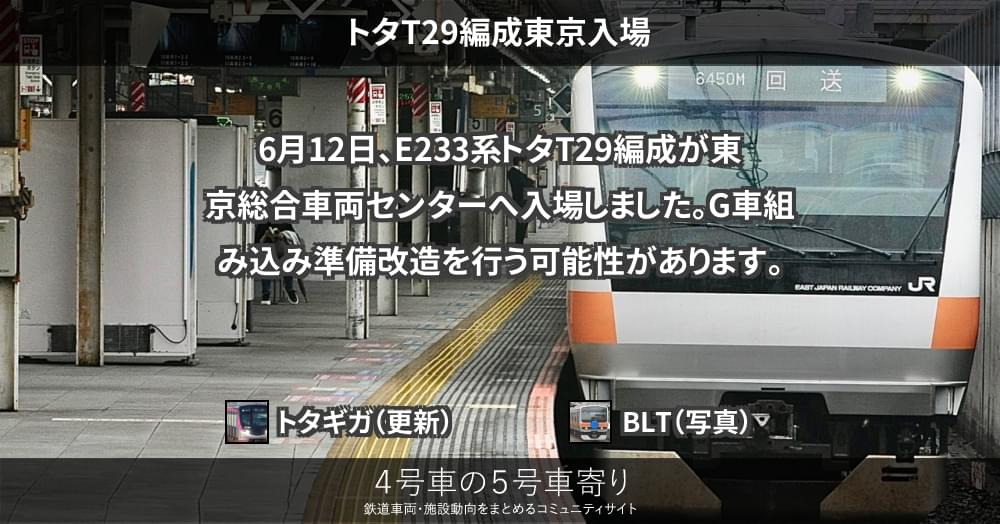 6月12日、E233系トタT29編成が東京総合車両センターへ入場しました。