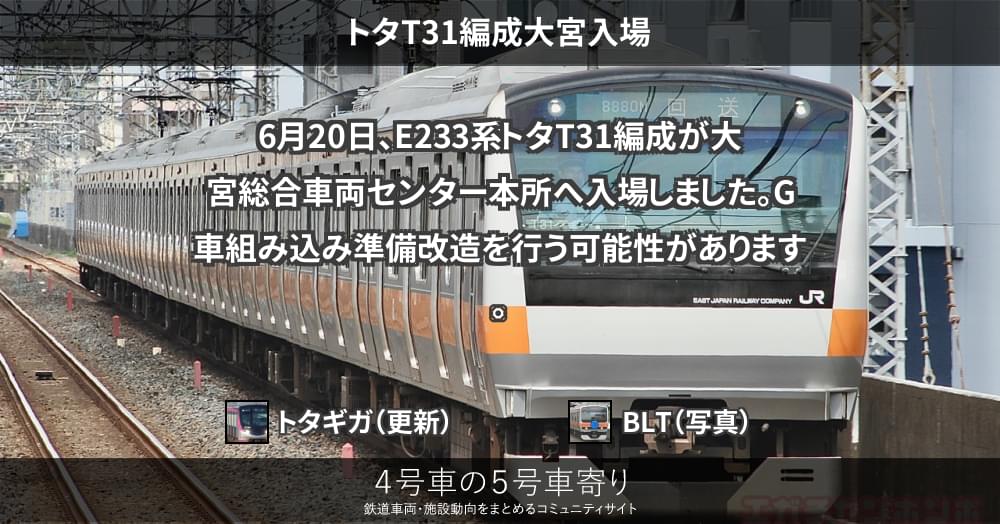 6月20日、E233系トタT31編成が大宮総合車両センター本所へ入場しました。
