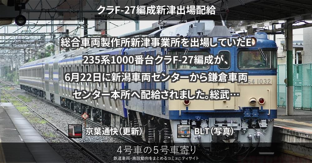 総合車両製作所新津事業所を出場していたE235系1000番台クラF-27編成が、6月22日に新潟車両センターから鎌倉車両センター本所へ配給されました。