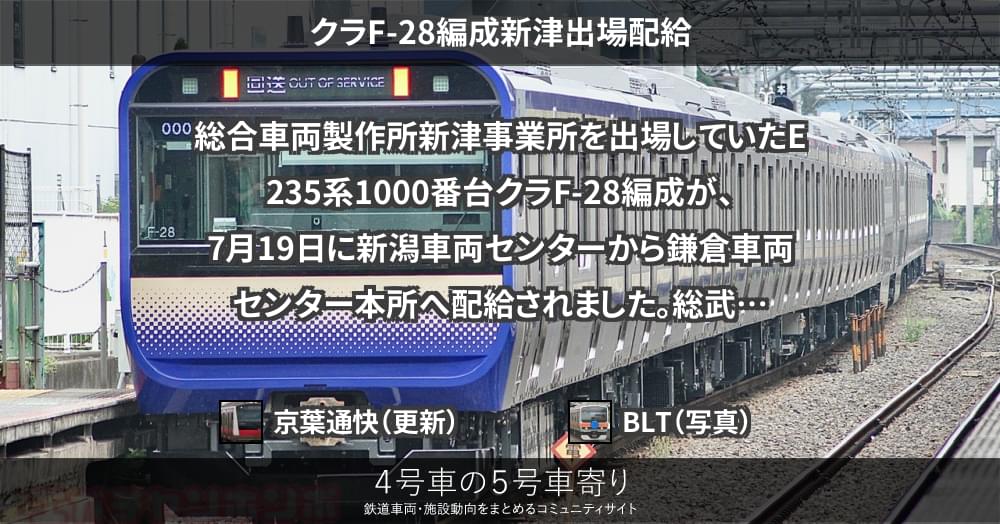 総合車両製作所新津事業所を出場していたE235系1000番台クラF-28編成が、7月19日に新潟車両センターから鎌倉車両センター本所へ配給されました。