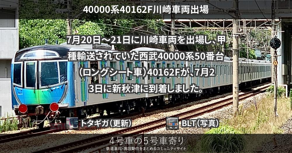 7月20日、西武40000系40162Fの内5両が川崎車両を出場し、神戸貨物ターミナルまで輸送されました。2023年度、同形式は10両編成4本が導入されることが明らかになっており、40162Fは先月末に出場した40161Fに続き、2本目にな...