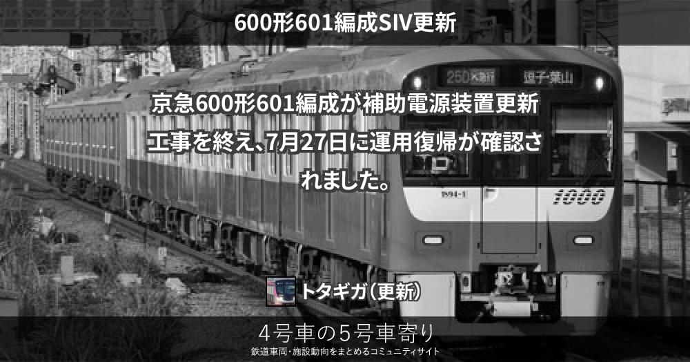 京急600形601編成が補助電源装置更新工事を終え、7月27日に運用復帰が確認されました。