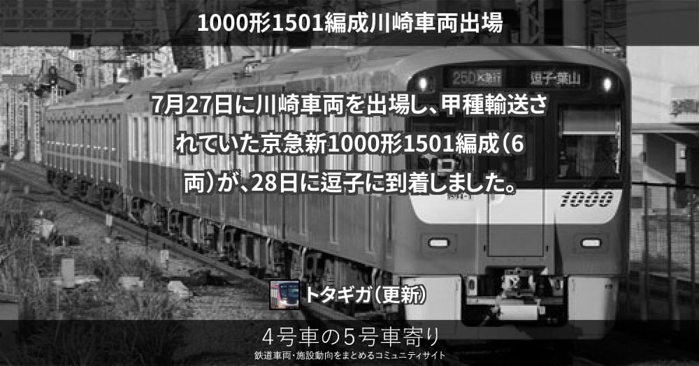 本日、京急新1000形1501編成が川崎車両を出場し、甲種輸送されています。牽引機は吹田タまではDD200-20が充当されています。この編成から、急行灯や側面表示器が従来の1000形6両編成のものから1890番台と同等のものに変更されている...